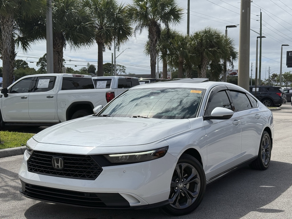 SAVE NOW DURING GARBER PRE-OWNED Sales Event! CARFAX One-Owner. CARFAX 1 OWNER, ADAPTIVE CRUISE CONTROL, BACKUP CAMERA, BLUETOOTH W/ TECH STREAMING, HEATED LEATHER SEATS, POWER DRIVER AND PASSENGER SEATS, POWER MOONROOF, REAR PARK ASSIST, REMOTE KEYLESS ENTRY, PUSH BUTTON START, ANDROID AUTO, APPLE CAR PLAY, LANE KEEP ASSIST, REMOTE START, DUAL ZONE AUTOMATIC CLIMATE CONTROL, Accord Hybrid EX-L, 4D Sedan, 2.0L 16V DOHC, eCVT, FWD, Platinum White Pearl, Gray Leather, 4-Wheel Disc Brakes, 8 Speakers, ABS brakes, Adaptive Cruise Control: Adaptive Cruise Control (ACC) with Low-Speed Follow, Air Conditioning, Alloy wheels, AM/FM radio, Apple CarPlay/Android Auto, Auto High-beam Headlights, Auto-dimming Rear-View mirror, Automatic temperature control, Brake assist, Bumpers: body-color, Compass, Delay-off headlights, Driver door bin, Driver vanity mirror, Dual front impact airbags, Dual front side impact airbags, Electronic Stability Control, Emergency communication system: HondaLink, Exterior Parking Camera Rear, Four wheel independent suspension, Front anti-roll bar, Front Bucket Seats, Front Center Armrest, Front dual zone A/C, Front reading lights, Fully automatic headlights, Heated door mirrors, Heated Front Bucket Seats, Heated front seats, Illuminated entry, Knee airbag, Lane departure: Lane Keeping Assist System (LKAS) active, Leather Shift Knob, Leather steering wheel, Leather-Trimmed Seat Trim, Low tire pressure warning, Memory seat, Occupant sensing airbag, Outside temperature display, Overhead airbag, Overhead console, Panic alarm, Passenger door bin, Passenger vanity mirror, Power door mirrors, Power driver seat, Power passenger seat, Power steering, Power windows, Radio data system, Radio: 180-Watt Audio System, Rear anti-roll bar, Rear reading lights, Rear seat center armrest, Rear side impact airbag, Rear window defroster, Remote keyless entry, Security system, Speed control, Speed-sensing steering, Speed-Sensitive Wipers, Split folding rear seat, Steering wheel mounted audio controls, Telescoping steering wheel, Tilt steering wheel, Traction control, Trip computer, Turn signal indicator mirrors, Variably intermittent wipers, Wheels: 17" x 7.5J Pewter Gray.